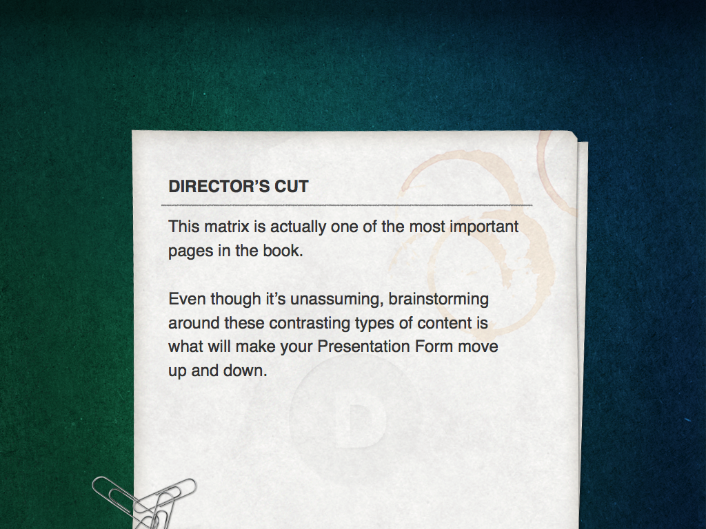 When you feel that you have firmly established your position and filtered your ideas, review the matrix from page 122 and validate that you retained enough interesting contrast. You don’t want contrast to hit the cutting-room floor during the vetting process. Filtering is very important. If you don’t filter your presentation, the audience will respond