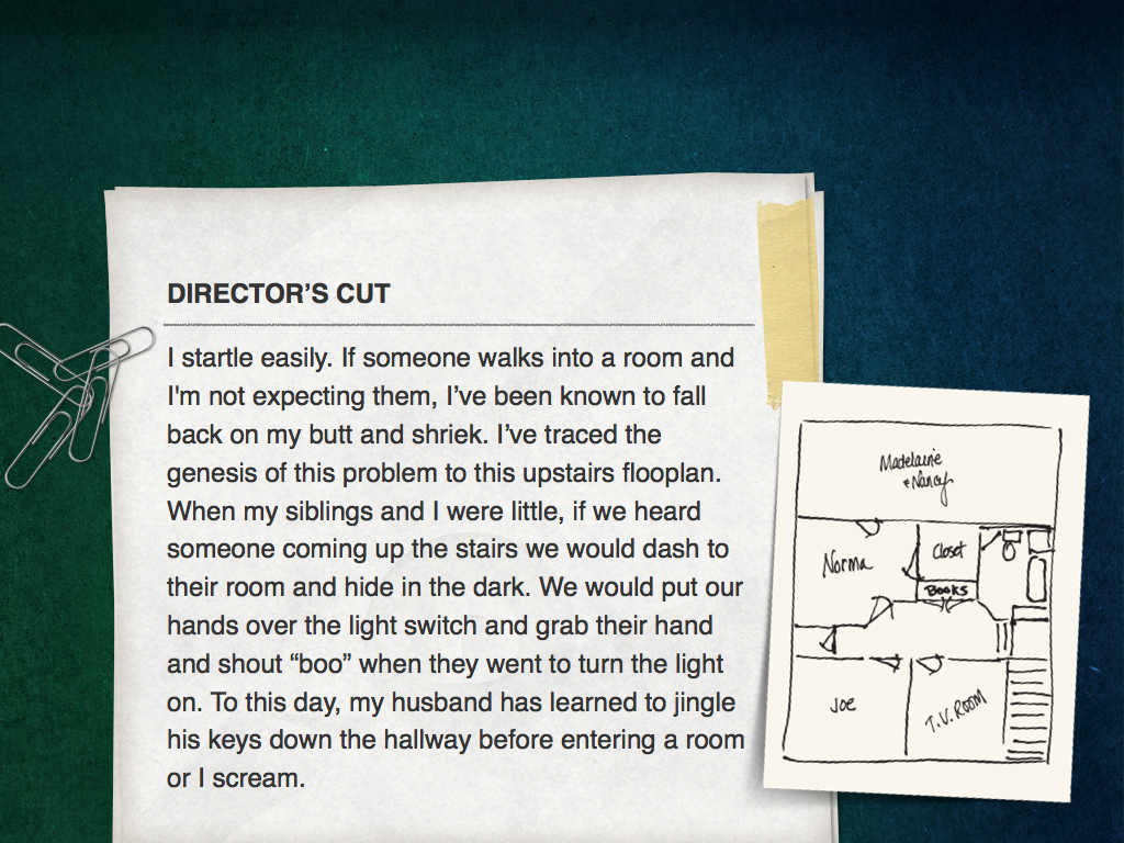 Once I needed a story for a presentation to convey remaining calm under pressure. I wanted to pull from an actual childhood memory. Instead of making a chronological timeline of my youth, I sketched the floor plan of the house where I lived as a little girl to trigger visual memories. As I traveled mentally from room to room, I recalled dormant memories of a lost turtle, stage productions in the basement, and other vivid images.