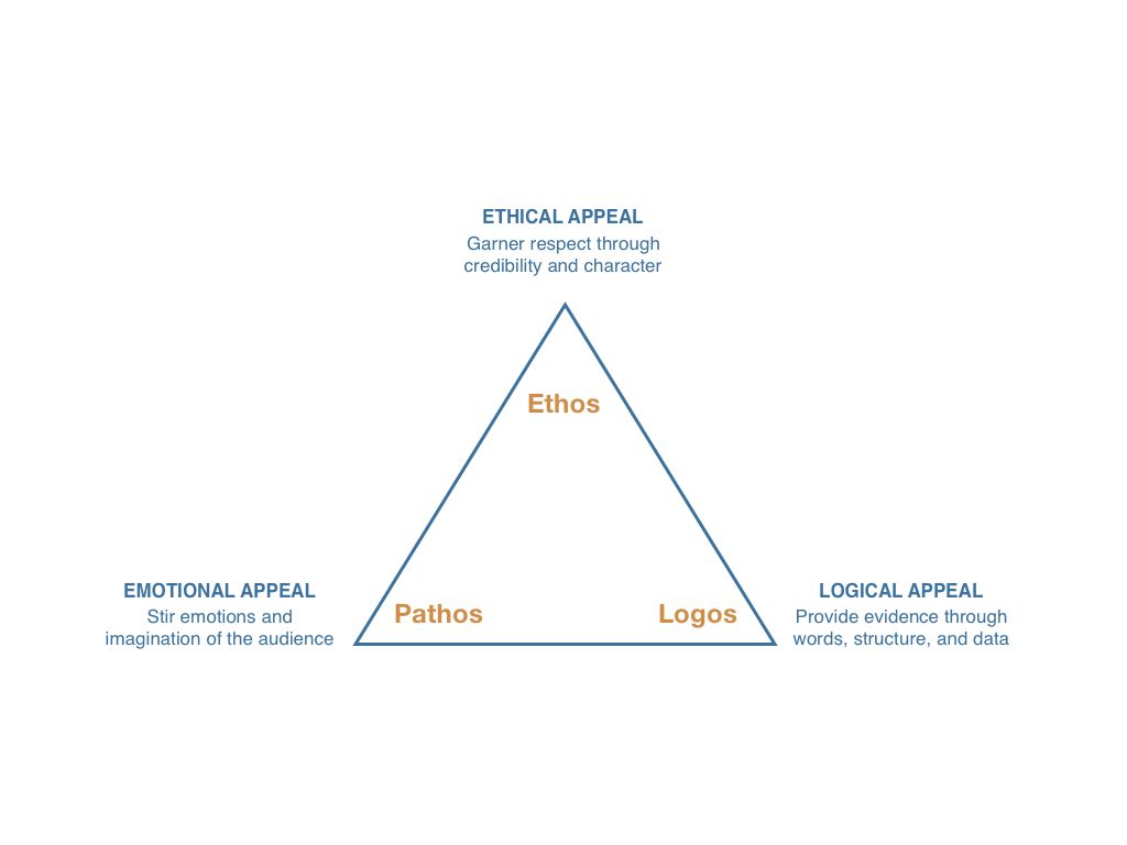Aristotle claimed that to persuade, one must employ three types of argument: ethical appeal (ethos), emotional appeal (pathos), and logical appeal (logos).1